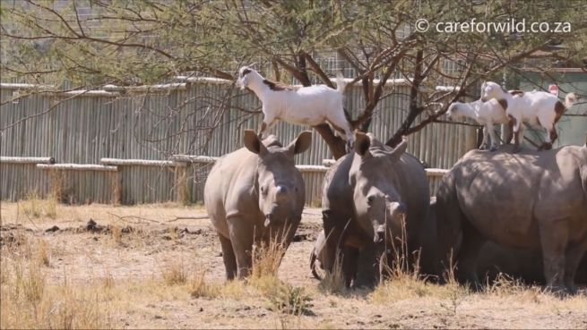 Ein ungewöhnliches Zusammenleben ist im 'Care for Wild'-Tierheim in Südafrika entstanden. Die Organisation 'Working With Rhinos' päppelt hier Nashörner auf. Und die Zwergziegen nutzen diese gerne als Klettergerüst.